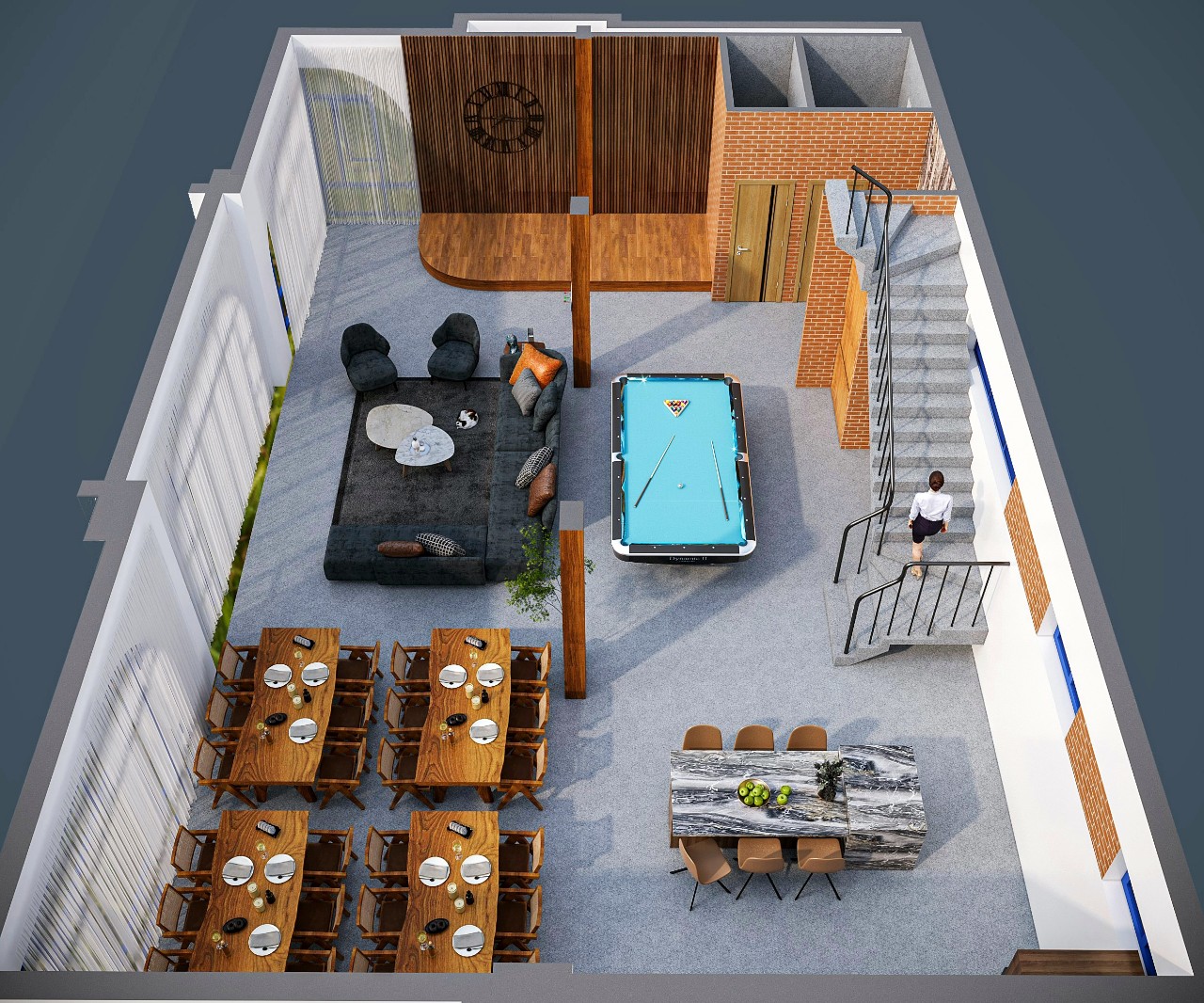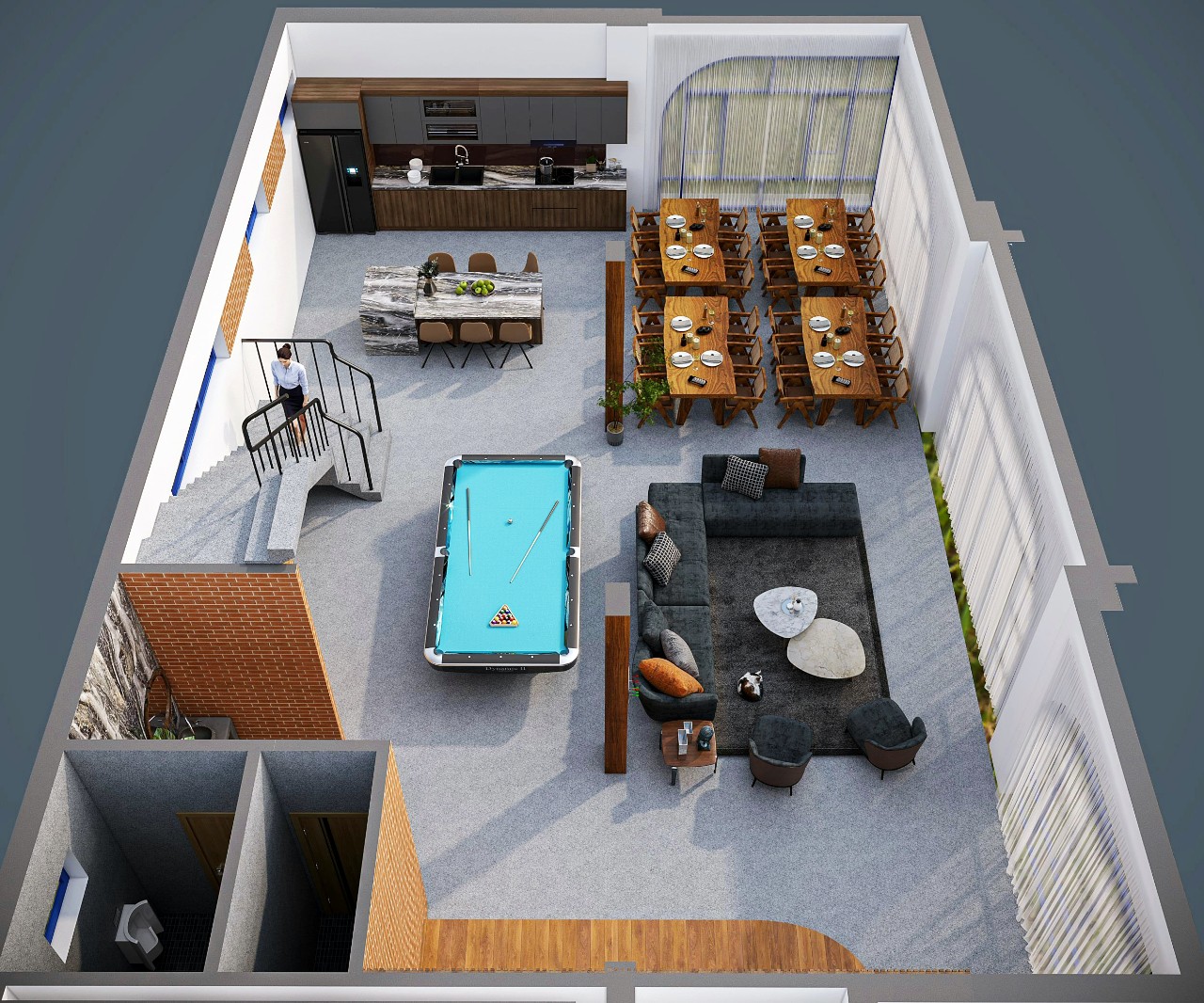 Phần nội thất tầng 1 đặc biệt hơn 1 số villa khác là có thêm bàn Bi A chơi giải trí vui vào ngoài giờ nghỉ ngơi hay ăn uống.