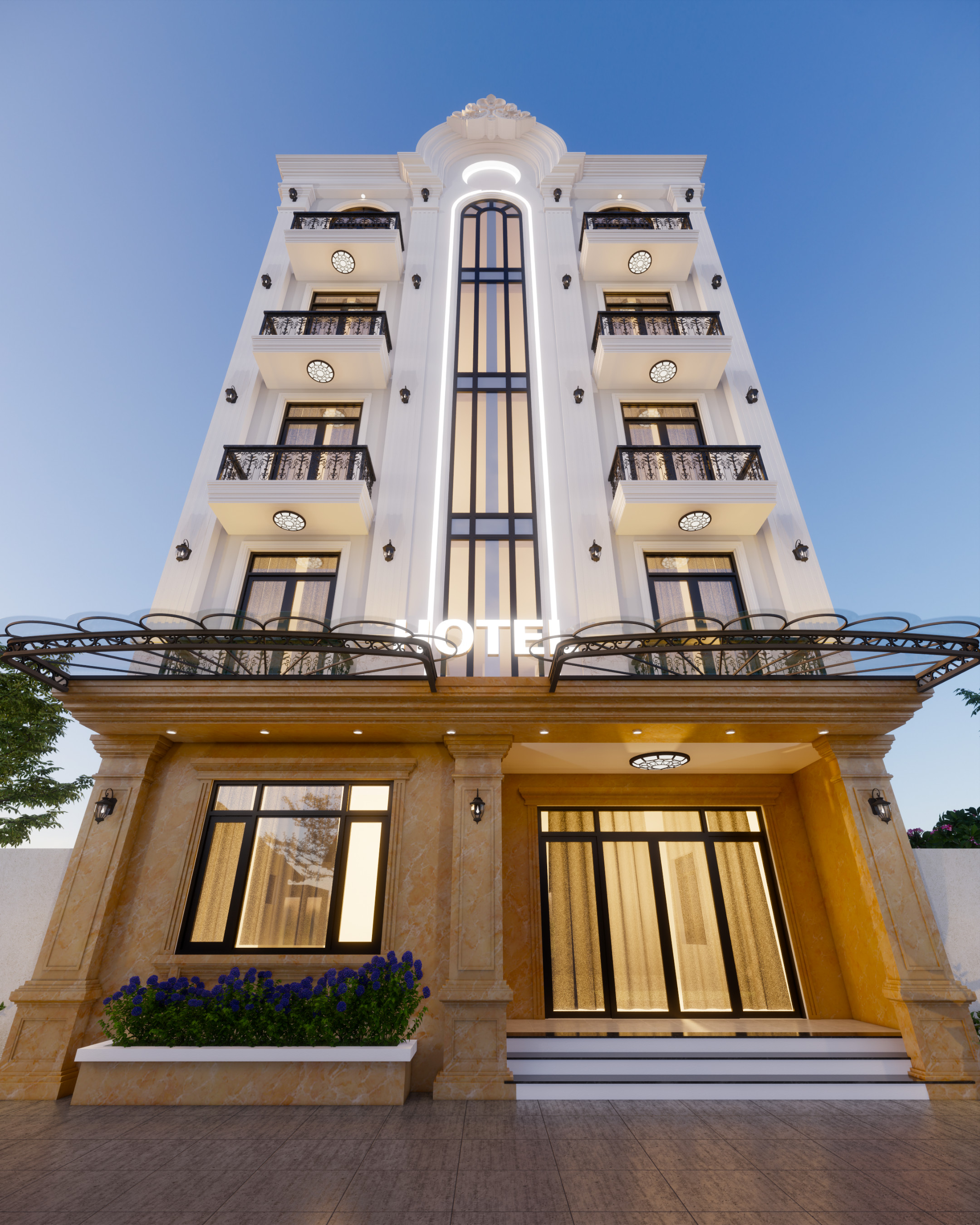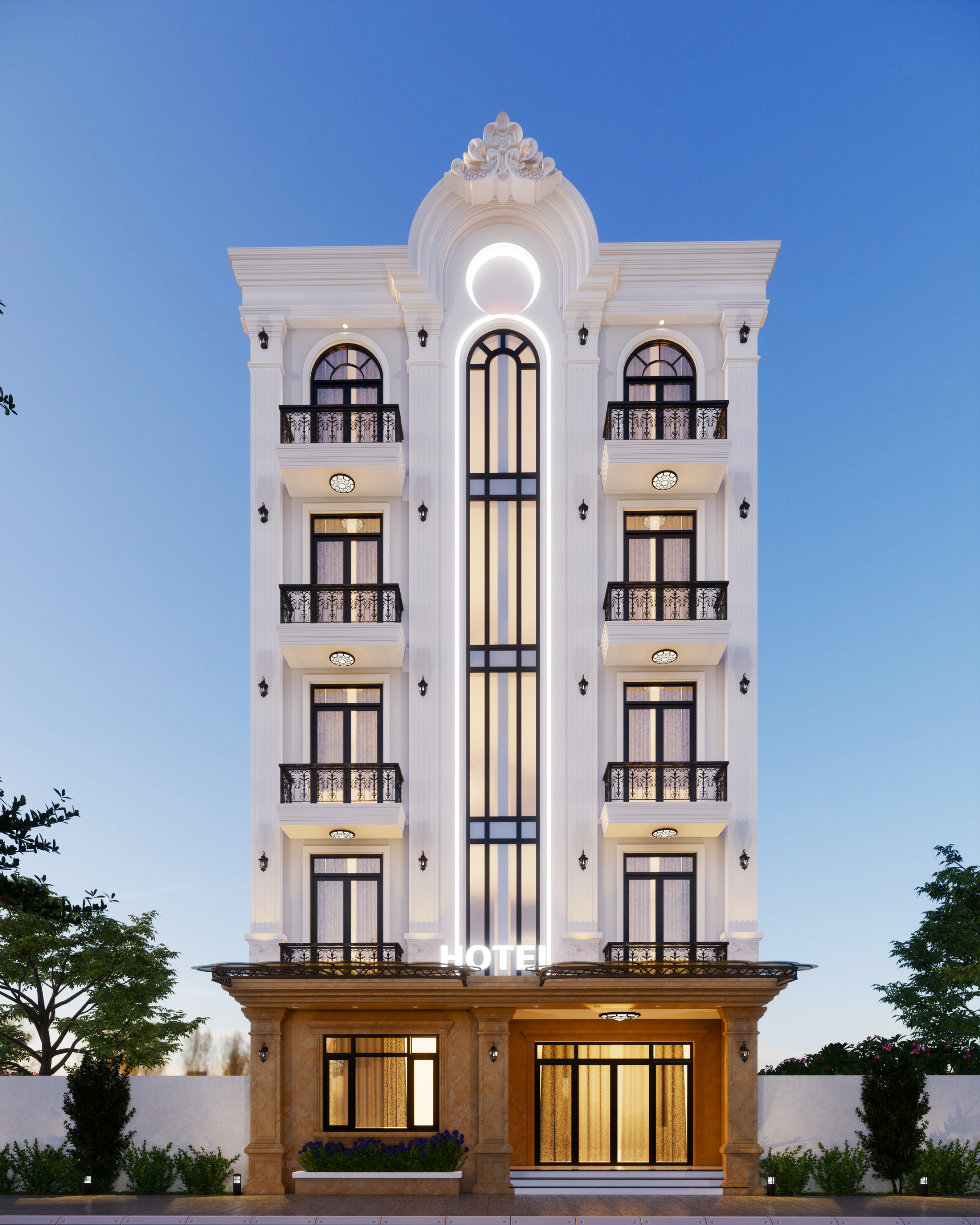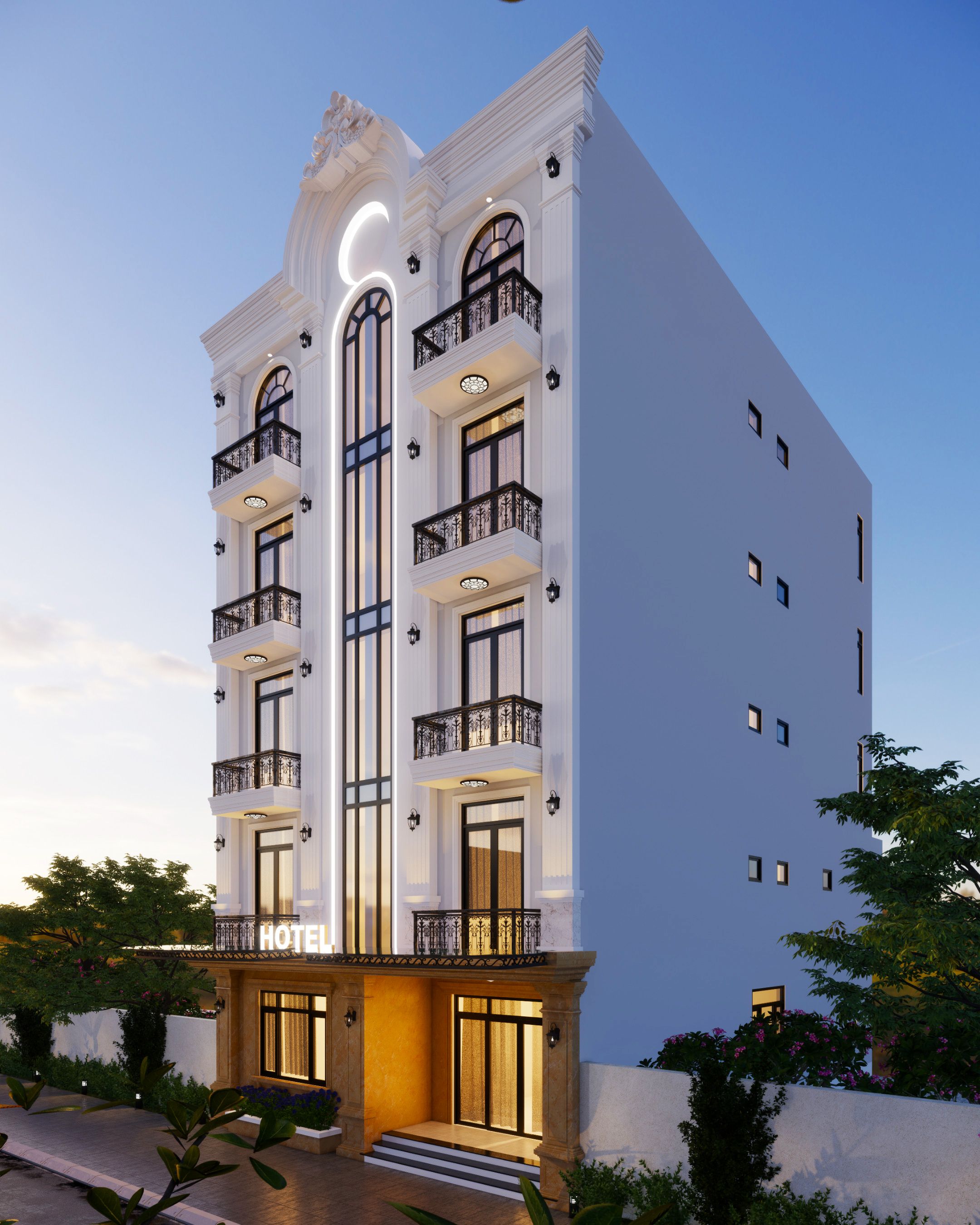 Khách sạn là một nơi không còn quá xa lạ với chúng ta nó được mọc lên ở khắp mọi nơi, mỗi một khách sạn có một phong cách khác nhau. Và đây là khách sạn mang phong cách tân cổ điển được thiết kế theo chiều dọc thẳng đứng 5 tầng và mỗi phòng bên ngoài đều có khu ban công được lắp bằng những thanh sắt chi tiết hoa văn tạo rõ nét tân cổ điển của khách sạn.