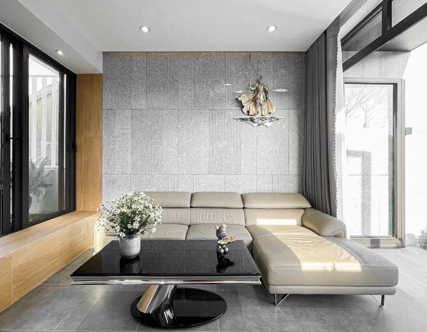 Ghế sofa chữ L rộng rãi, bàn trà mặt kính hiện đại cùng điểm nhấn trang trí tường đơn giản mà tinh tế. Không gian mở kết nối trực tiếp với sân vườn tạo sự thư giãn.