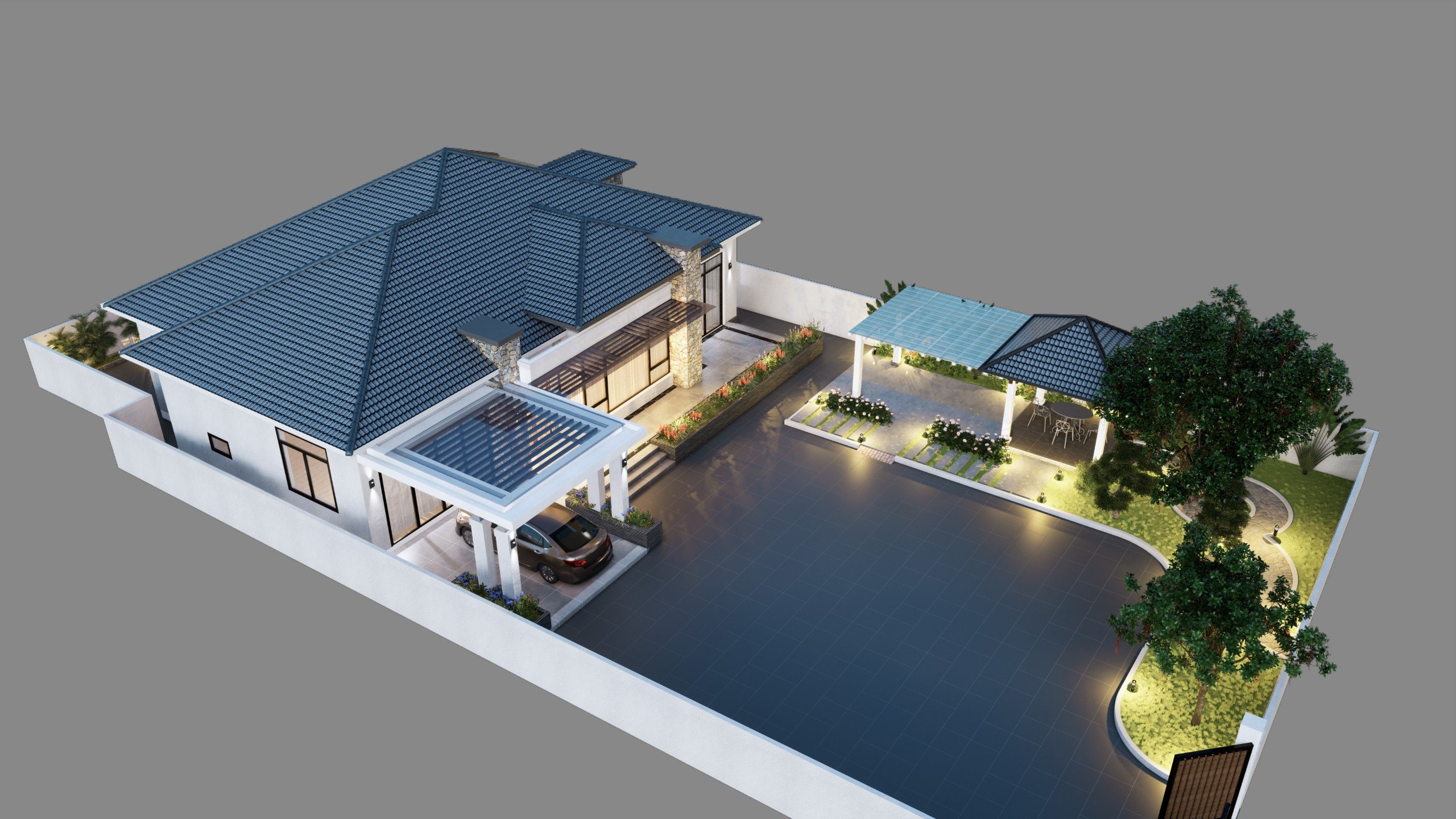 Ở khu vực trước sân nhà cũng được thiết kế 1 cá chòi nghỉ tạo thêm điểm nhấn cũng như phần thẩm mỹ cho căn nhà. Hơn nữa cũng để cho gia đình có một không gian uống nước thoáng đãng, mát mẻ ngồi trò chuyện cũng như tiếp khách. Cạnh đó cũng được trông thêm hoa cỏ xanh mát giúp cho toàn bộ khung cảnh ngôi nhà có phần màu sắc.