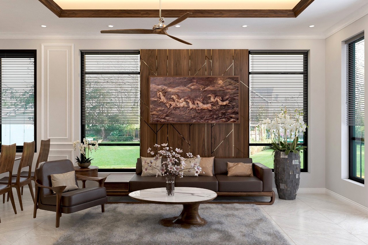 Bước vào đầu tiên bạn sẽ thấy phòng khách bao giờ cũng mang đến sự đơn giản và tiện nghi. Điều này biểu hiện rõ rệt ở các vật dụng, thiết bị điện tử, điện lạnh như: dàn âm li, loa, tivi, quạt điều hòa,…Bên cạnh đó, các bức tranh treo tường cũng là những thiết bị tuyệt vời mang đậm phong cách đó.