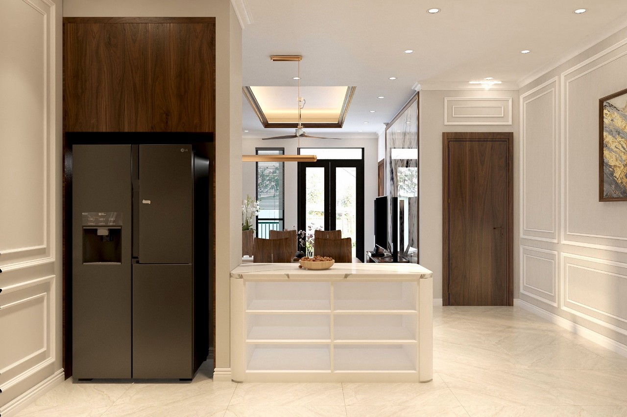 Phòng bếp của một phong cách thiết kế nội thất hiện đại bao giờ cũng đảm bảo công năng nấu nướng hoàn chỉnh. Đây cũng là khu vực mà bàn ăn được đặt gọn gàng.