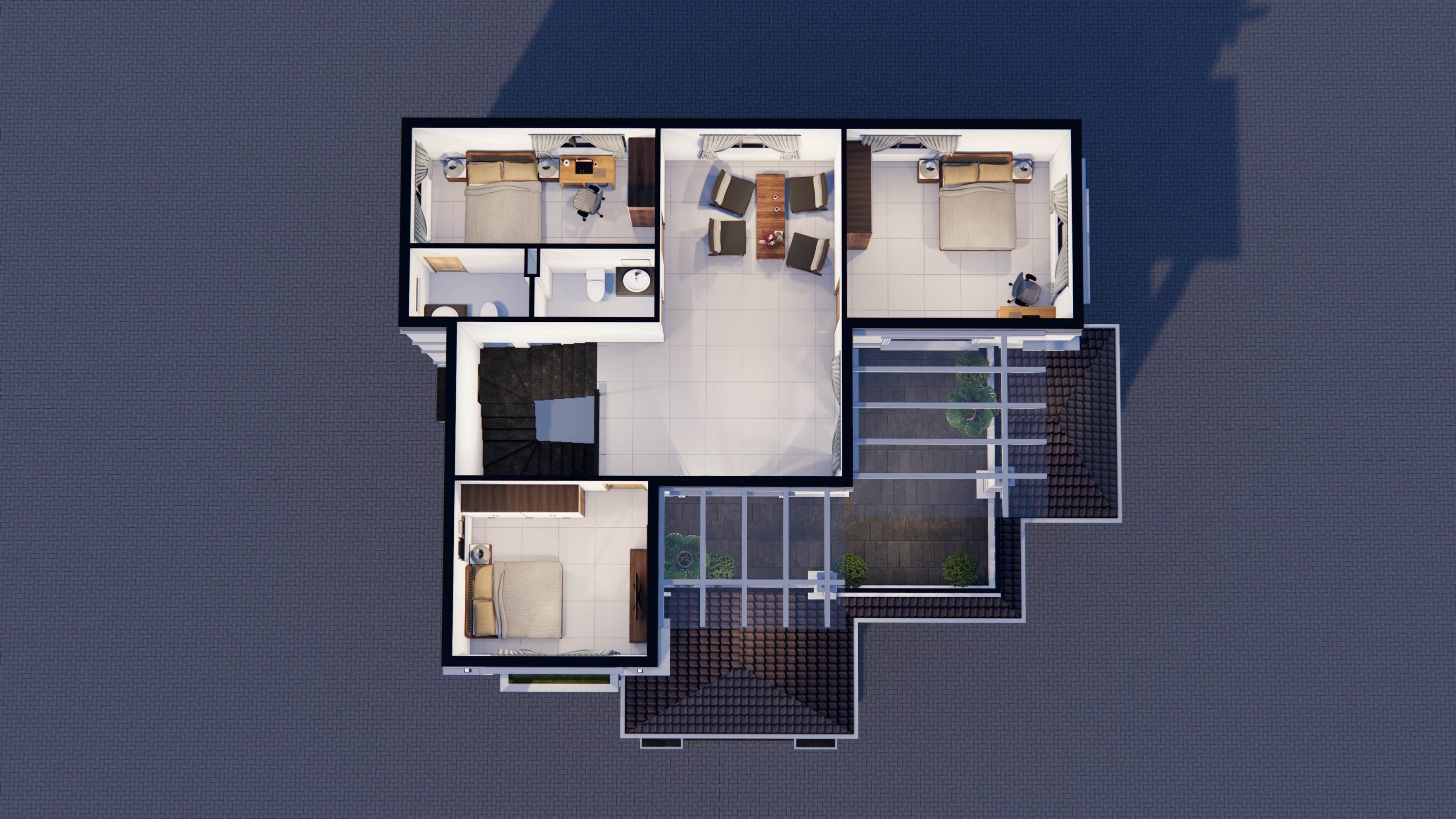 Mặt bằng tầng 2 với khu vực thang, sinh hoạt chung ở chính giữa, và 2 bên là không gian của 3 phòng ngủ. Cùng lối hành lang giao thông thuận tiện.