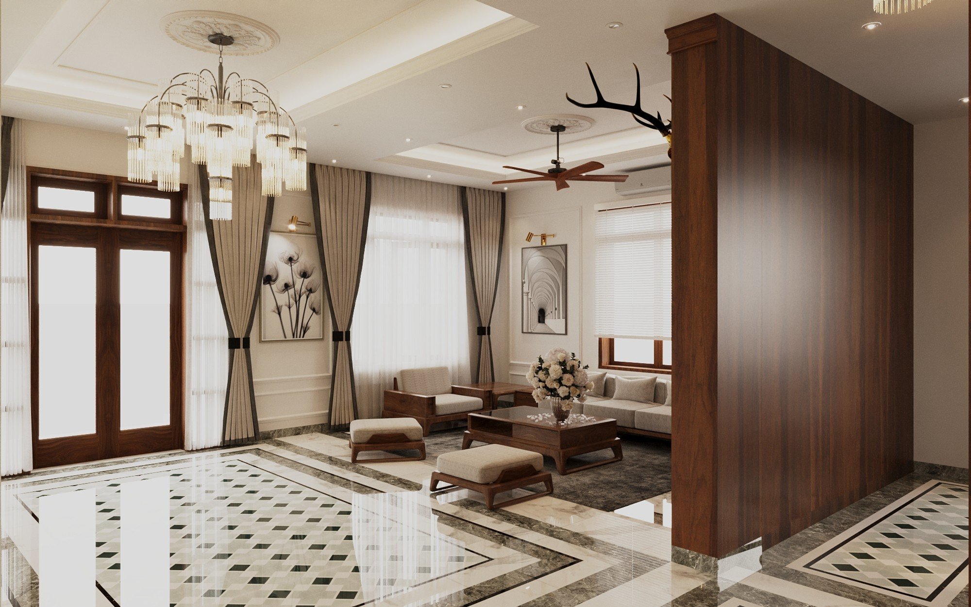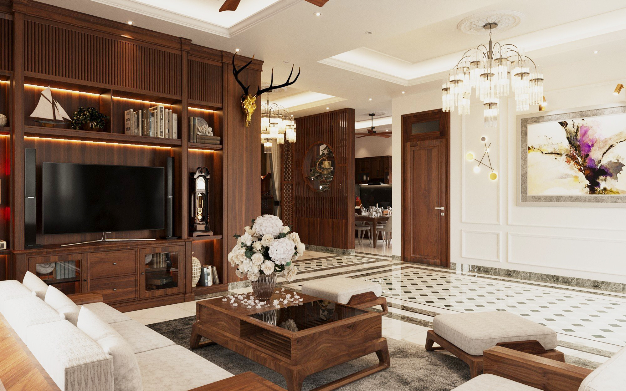 Với phong cách thiết kế nội thất phòng khách này, thường sử dụng các màu sắc trung tính làm nền chủ đạo như trắng, xám khói, … Sau đó thêm một mảng tường được trang trí thêm tranh màu nổi bật để làm điểm nhấn cho căn phòng. Nội thất của căn phòng thường mang hơi hướng thiết kế châu âu hiện đại. Khi lựa chọn nội thất, các bạn hãy lưu ý chọn đồ tương ứng về màu sắc, kích thước với màu sơn, diện tích căn phòng