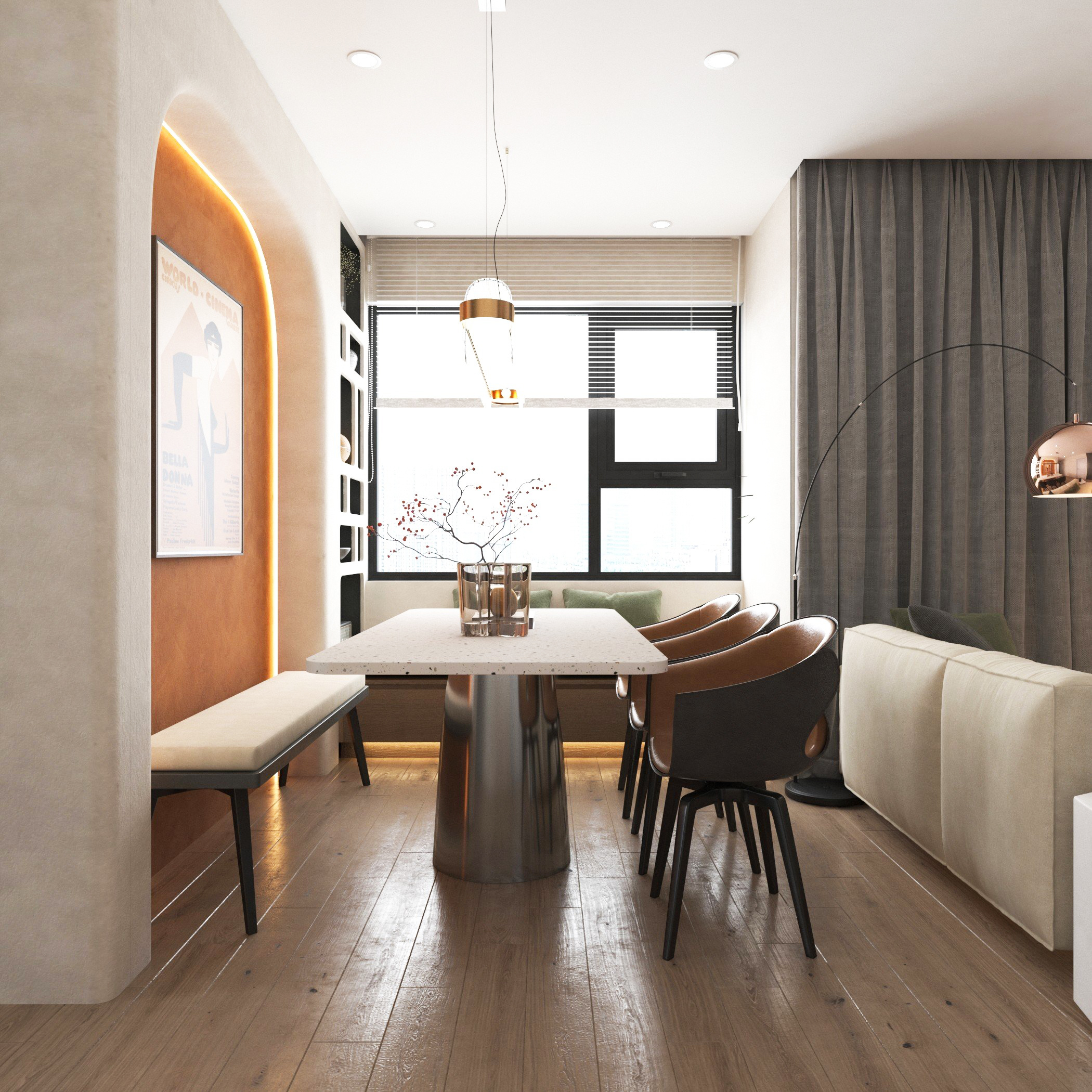 Khu vực bàn ăn sẽ đặt liền kề phòng khách, kết hợp với tủ rượu cao cấp, hướng gia chủ đến với một không gian ăn uống sang trọng và đầy ấm cúng. Trong khi đó, khu vực tủ bếp nấu ăn sẽ được đặt một góc riêng ngăn cách với không gian bên ngoài bằng hệ cửa kính. Điều này giúp tối ưu việc giữ gìn vệ sinh cho các khu vực mà vẫn không gây cảm giác bí bách, rời rạc