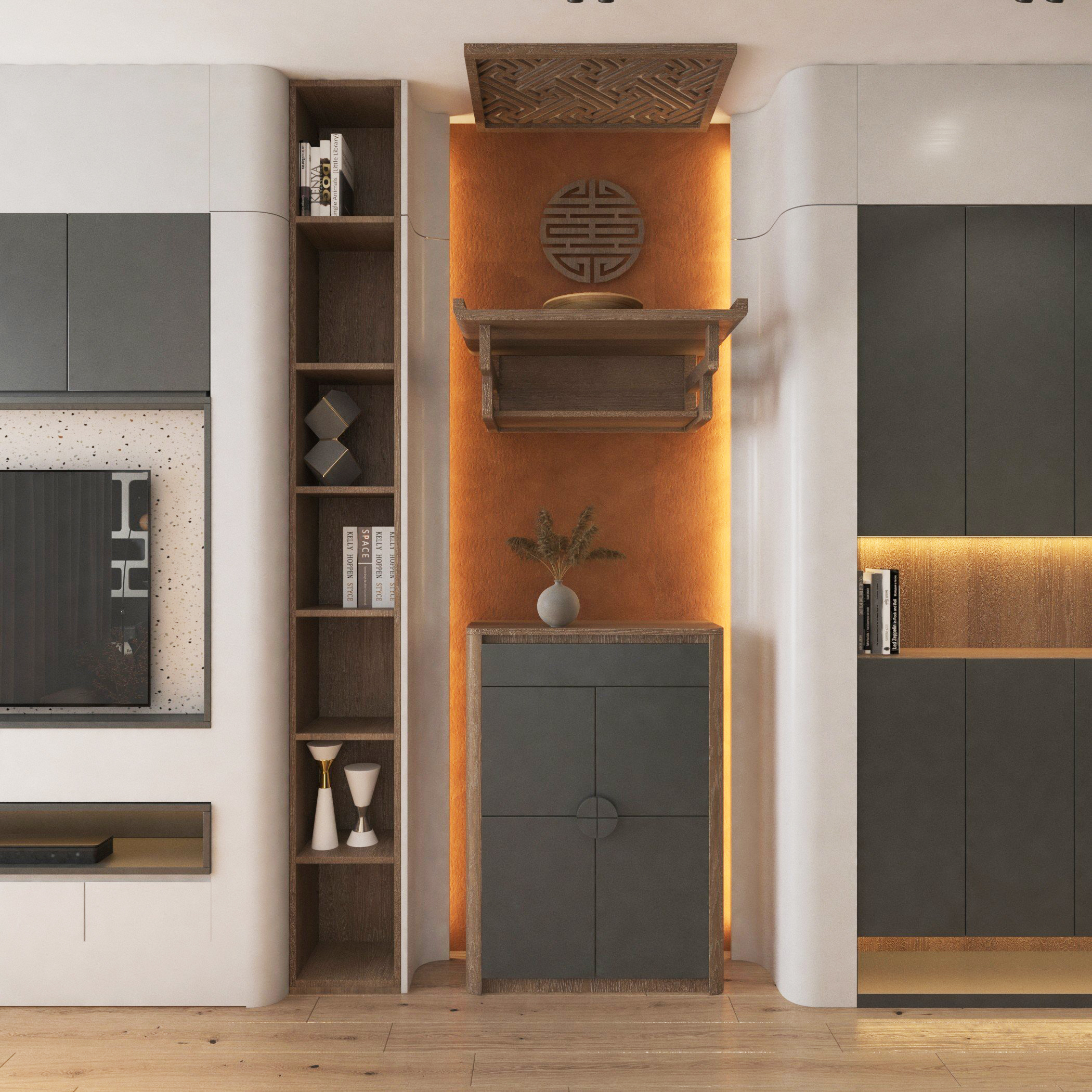 Và phần thờ gia tiên cũng được kiến trúc sư thiết kế một cách gọn gàng tối ưu hóa diện tích nhất mức có thể, tất cả mọi thứ trong căn chung cư được sắp xếp hài hòa với không gian sống trong nhà