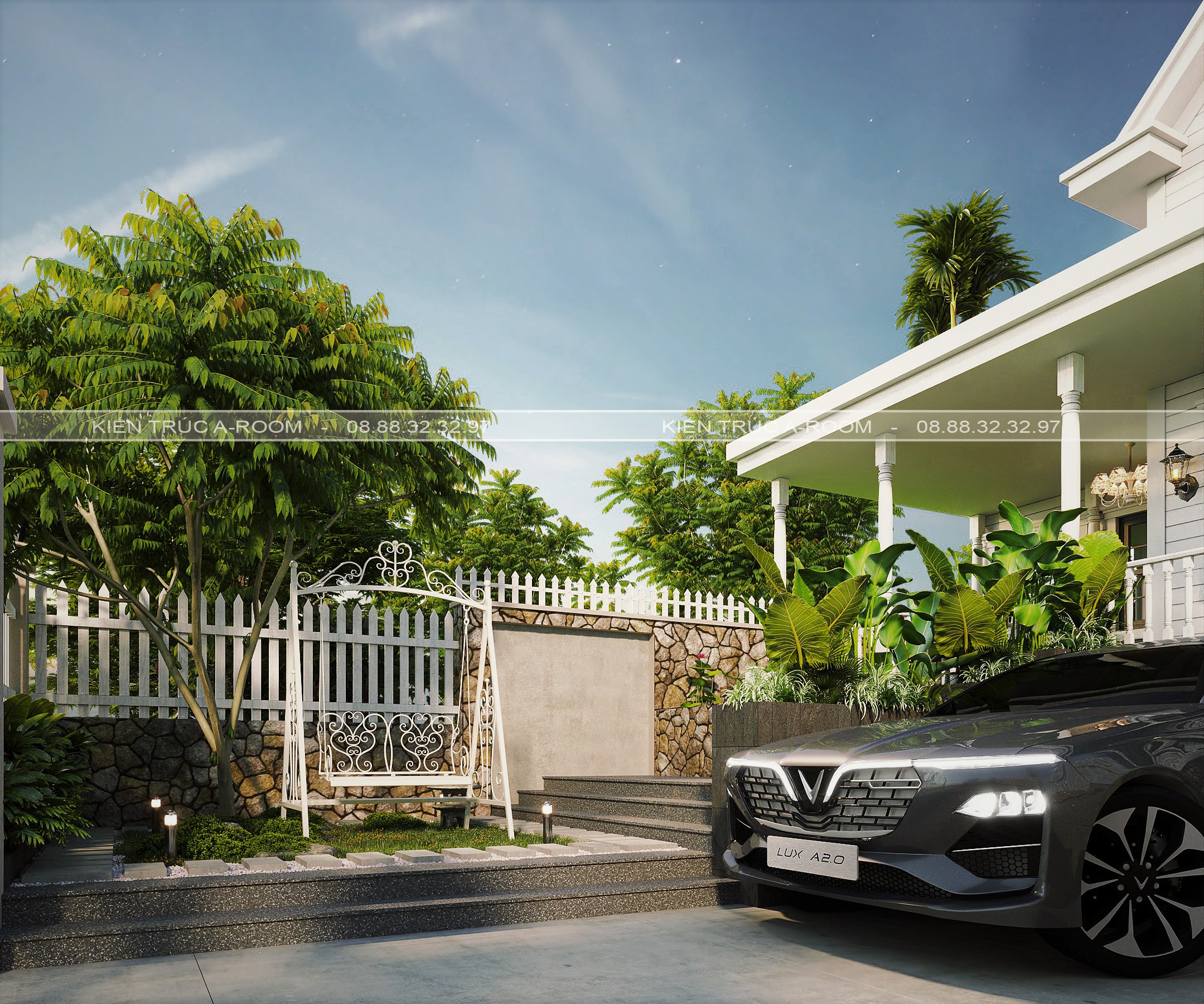 Trước mặt bậc thang cũng được thiết kế khoảng sân trống nhỏ đặt xích đu ngồi thư giãn hay trẻ con cũng có thể ngồi chơi có bóng cây mát mẻ.