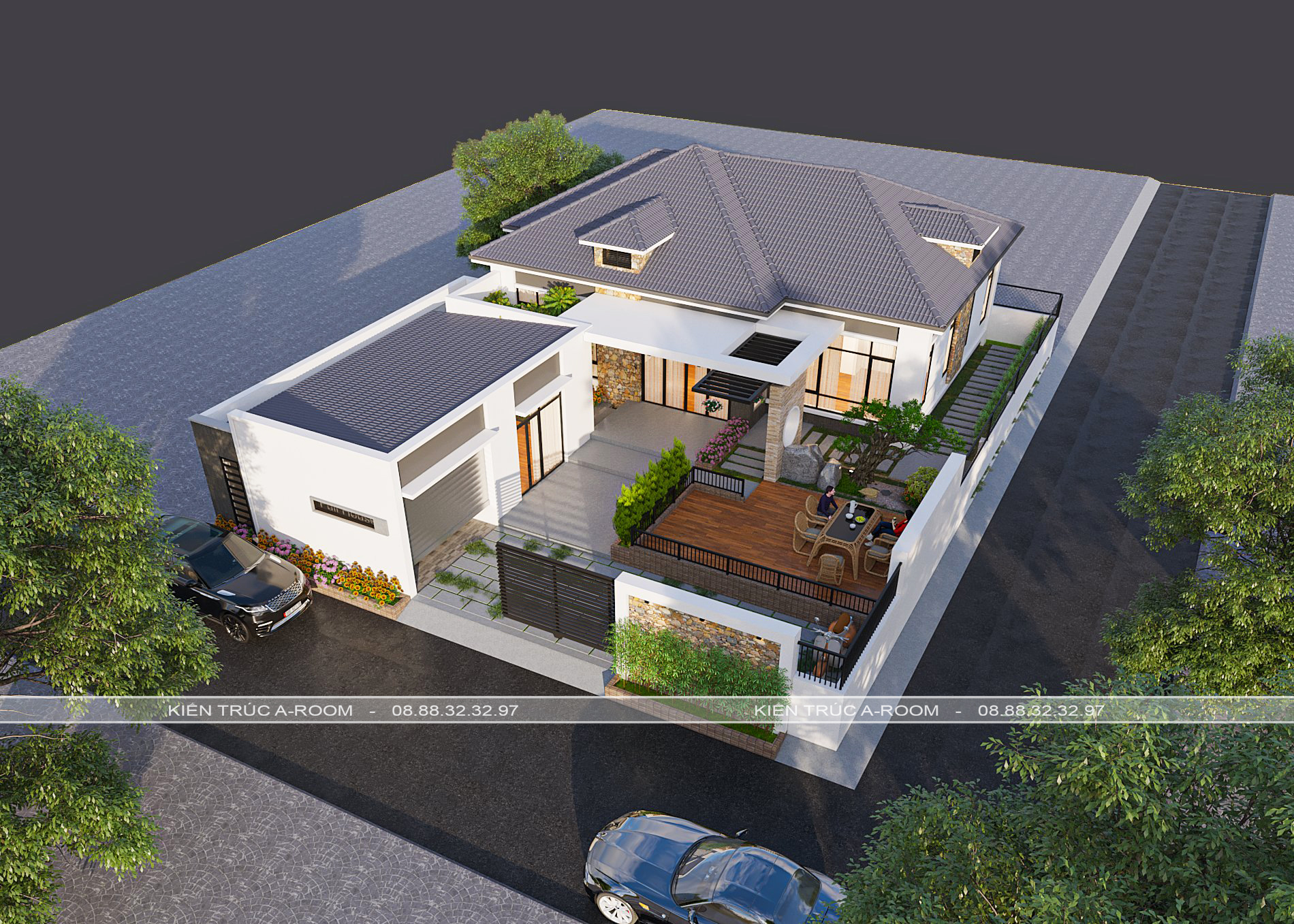 Nhìn vào mặt tiền của mẫu nhà 1 tầng mái nhật này các bạn sẽ thấy được cách thiết kế và bố trí vô cùng khéo léo của kiến trúc sư. Công trình này được thiết kế với 4 phòng ngủ, 1 phòng khách và 1 phòng thờ, khối bếp và gara ô tô được thiết kế tách rời mang đến sự thuận tiện với nếp sống ở vùng ngoại thành Hà Nội và đáp ứng được nhu cầu sinh hoạt của gia chủ.