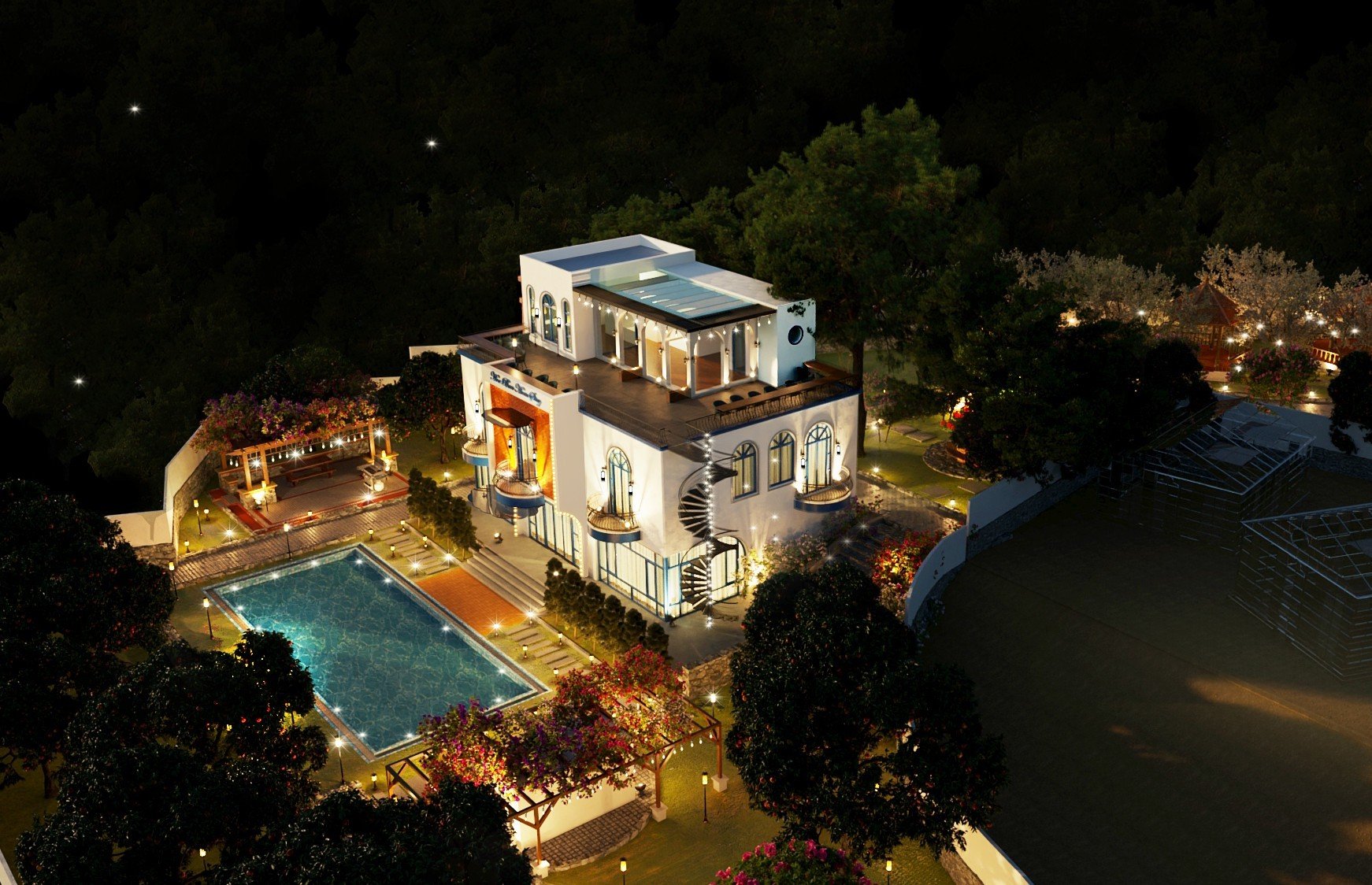 Không gian buổi tối của căn villa được bố trí đèn ánh sáng đầy đủ cho không gian thêm phần lung linh và rực rỡ sắc màu.