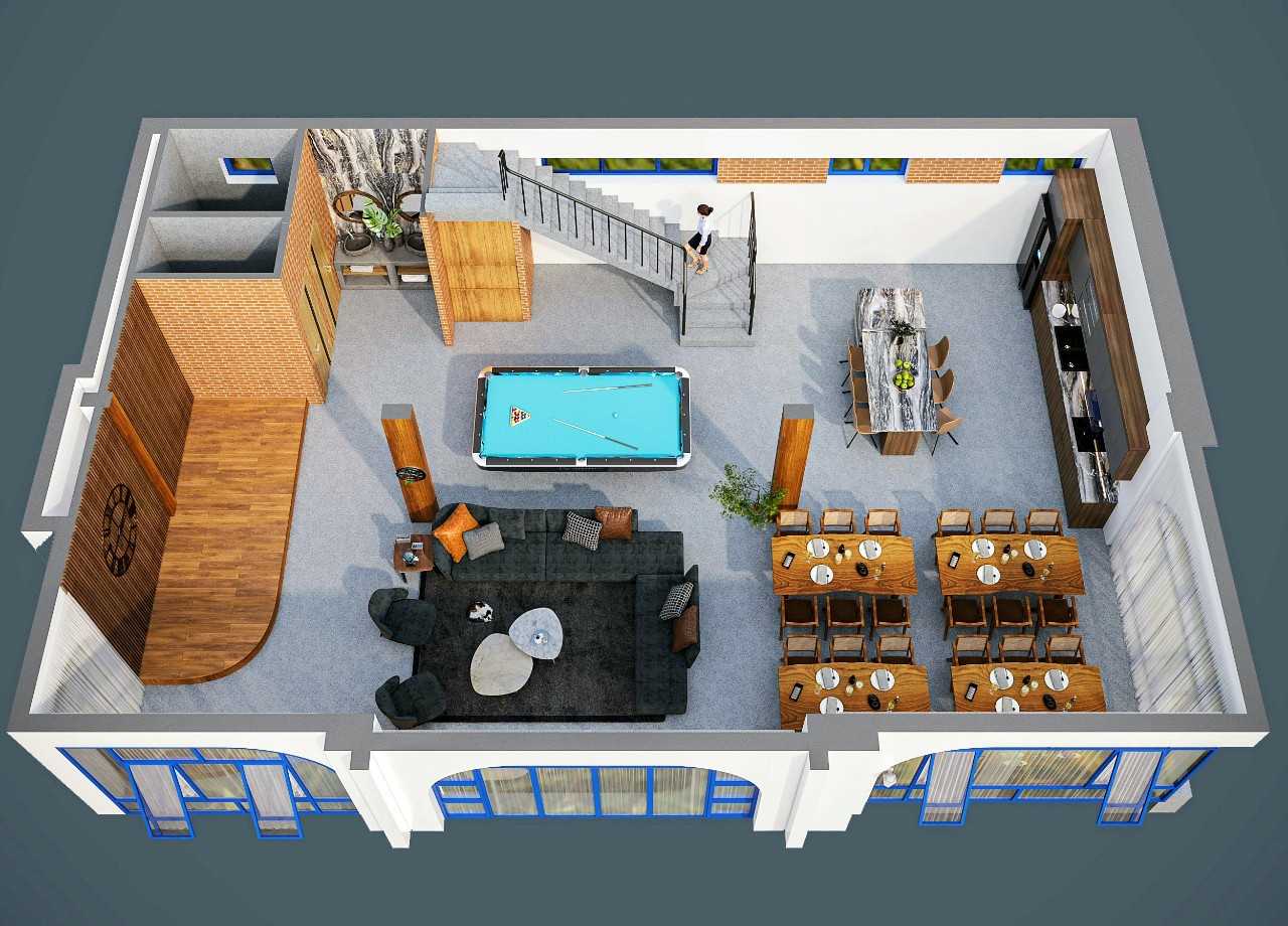Phần nội thất tầng 1 đặc biệt hơn 1 số villa khác là có thêm bàn Bi A chơi giải trí vui vào ngoài giờ nghỉ ngơi hay ăn uống.