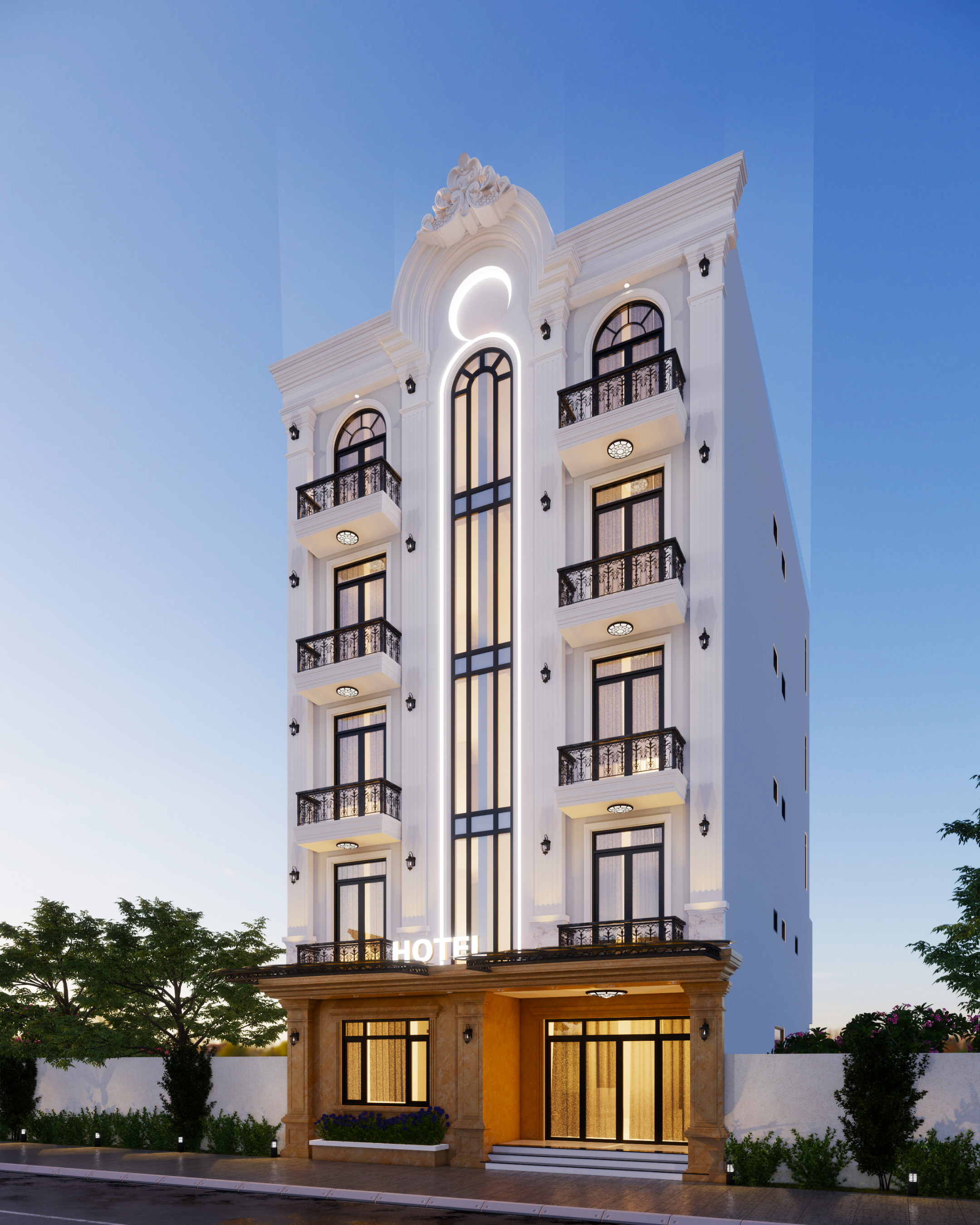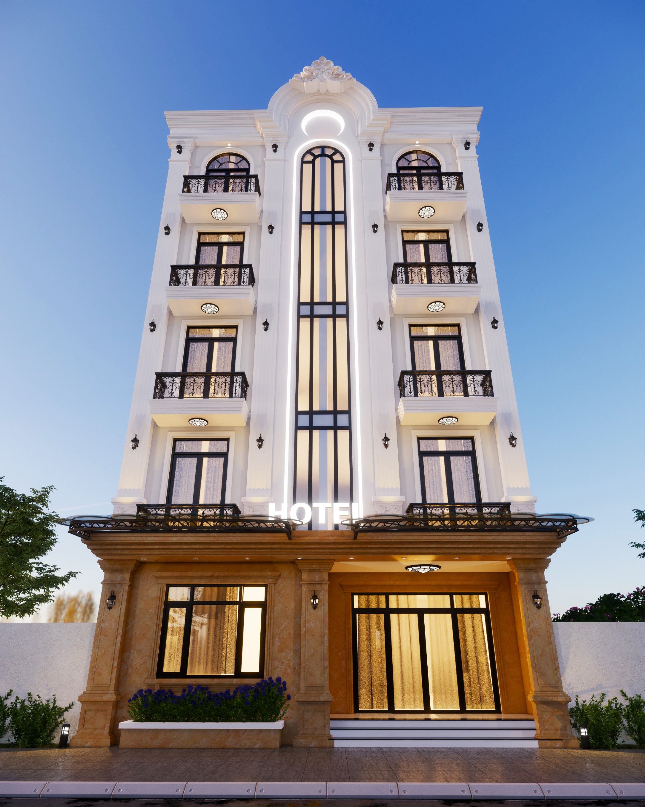 Khách sạn là một nơi không còn quá xa lạ với chúng ta nó được mọc lên ở khắp mọi nơi, mỗi một khách sạn có một phong cách khác nhau. Và đây là khách sạn mang phong cách tân cổ điển được thiết kế theo chiều dọc thẳng đứng 5 tầng và mỗi phòng bên ngoài đều có khu ban công được lắp bằng những thanh sắt chi tiết hoa văn tạo rõ nét tân cổ điển của khách sạn.