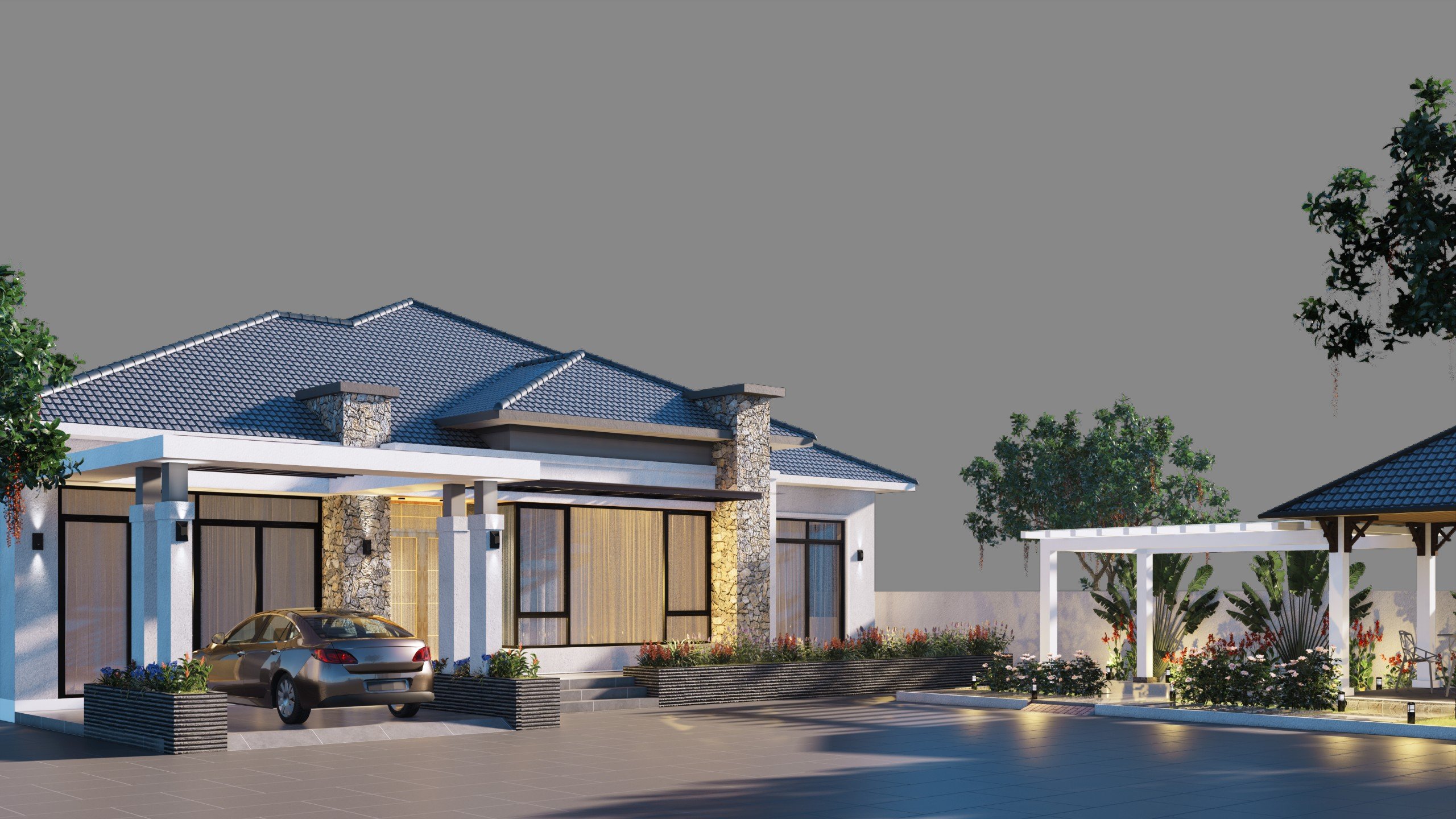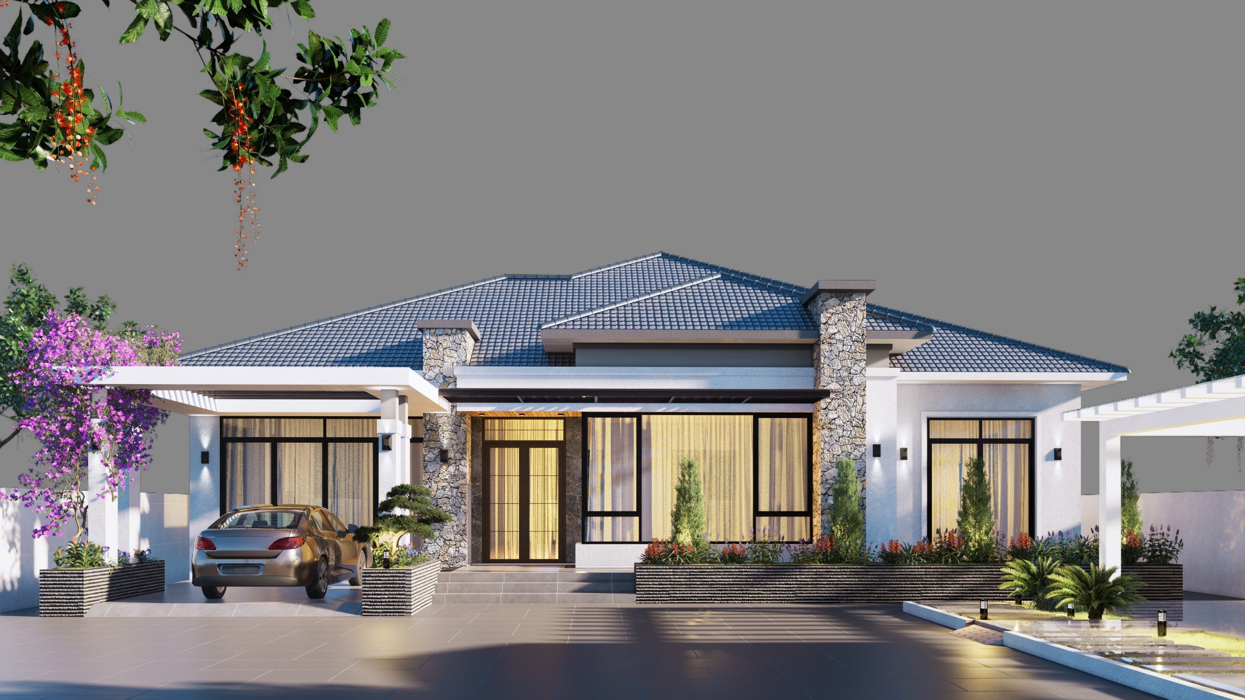 Ở khu vực trước sân nhà cũng được thiết kế 1 cá chòi nghỉ tạo thêm điểm nhấn cũng như phần thẩm mỹ cho căn nhà. Hơn nữa cũng để cho gia đình có một không gian uống nước thoáng đãng, mát mẻ ngồi trò chuyện cũng như tiếp khách. Cạnh đó cũng được trông thêm hoa cỏ xanh mát giúp cho toàn bộ khung cảnh ngôi nhà có phần màu sắc.