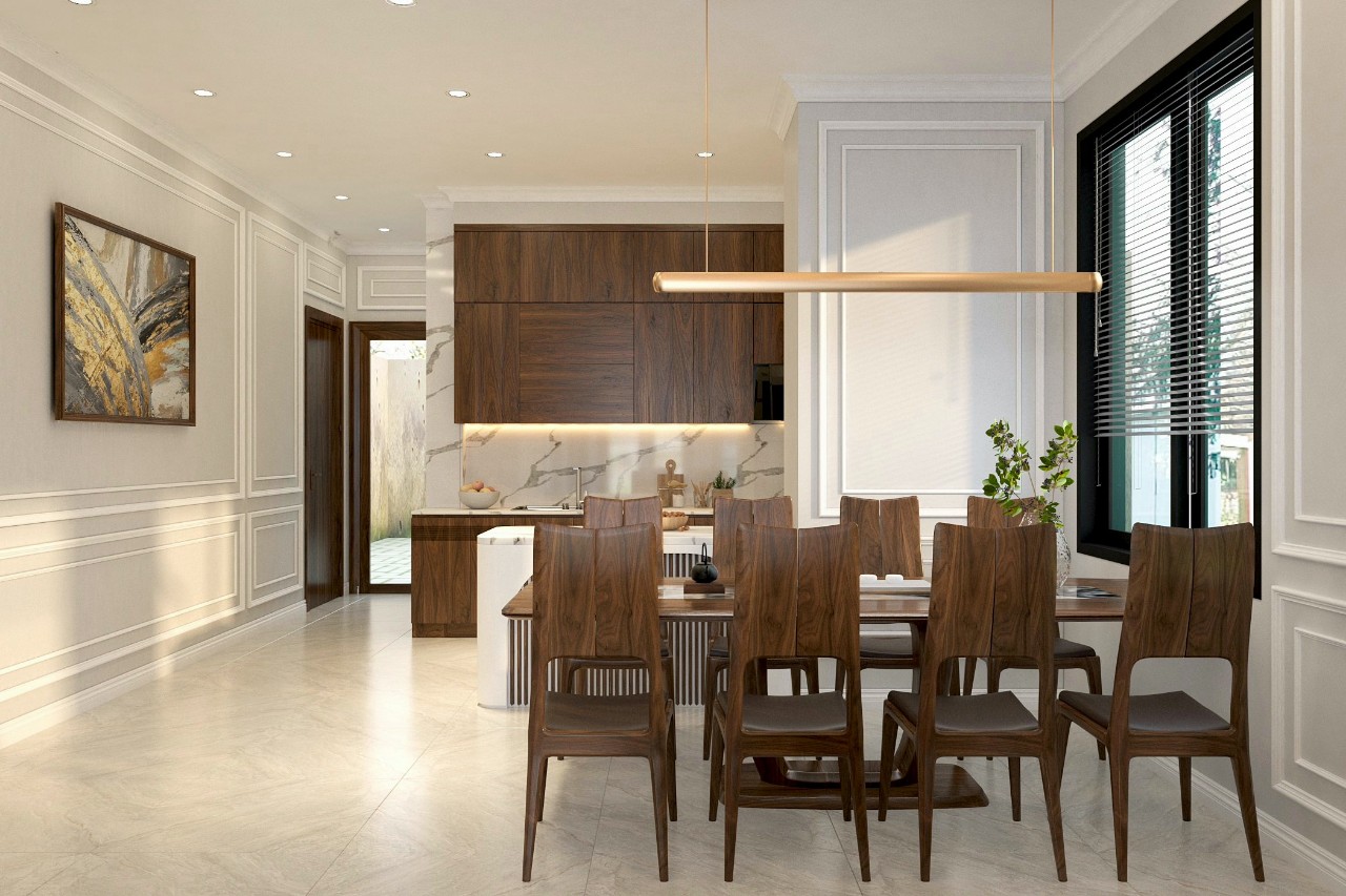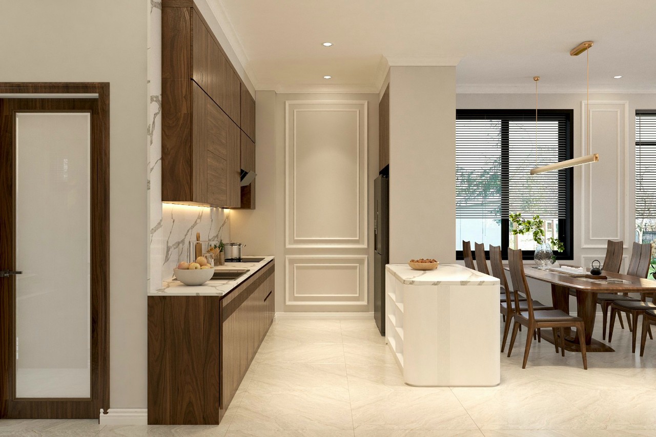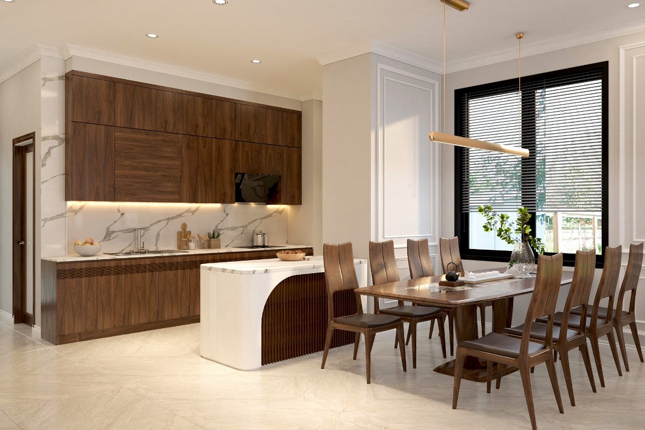 Phòng bếp của một phong cách thiết kế nội thất hiện đại bao giờ cũng đảm bảo công năng nấu nướng hoàn chỉnh. Đây cũng là khu vực mà bàn ăn được đặt gọn gàng.
