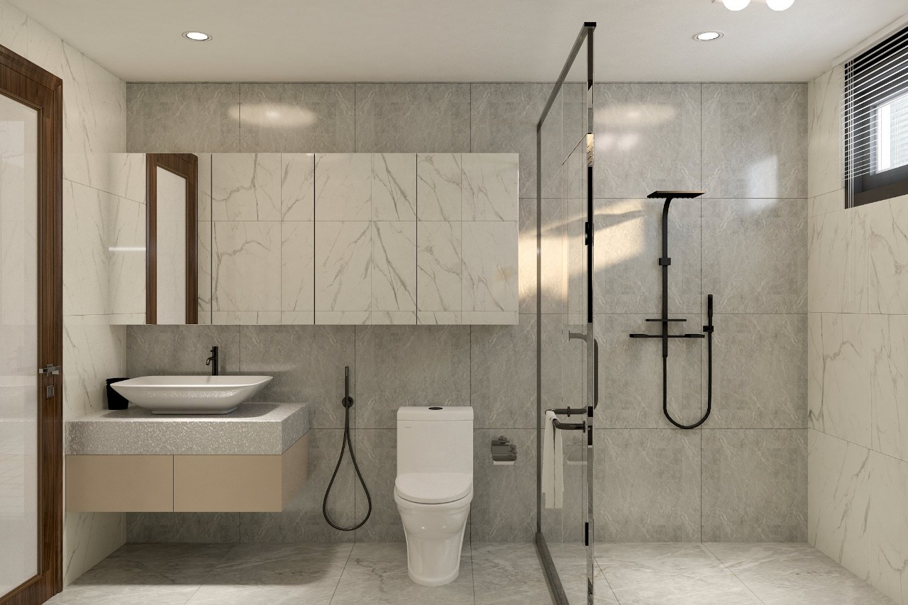 Nhà vệ sinh chung được thiết kế phong cách hiện đại đầy đủ tiện nghi, sang trọng. Không gian nhà vệ sinh được kiến trúc sư tách biệt thành không gian ướt và không gian khô, điều này mang đến sự tiện ích trong sử dụng và sự mạch lạc trong thiết kế.