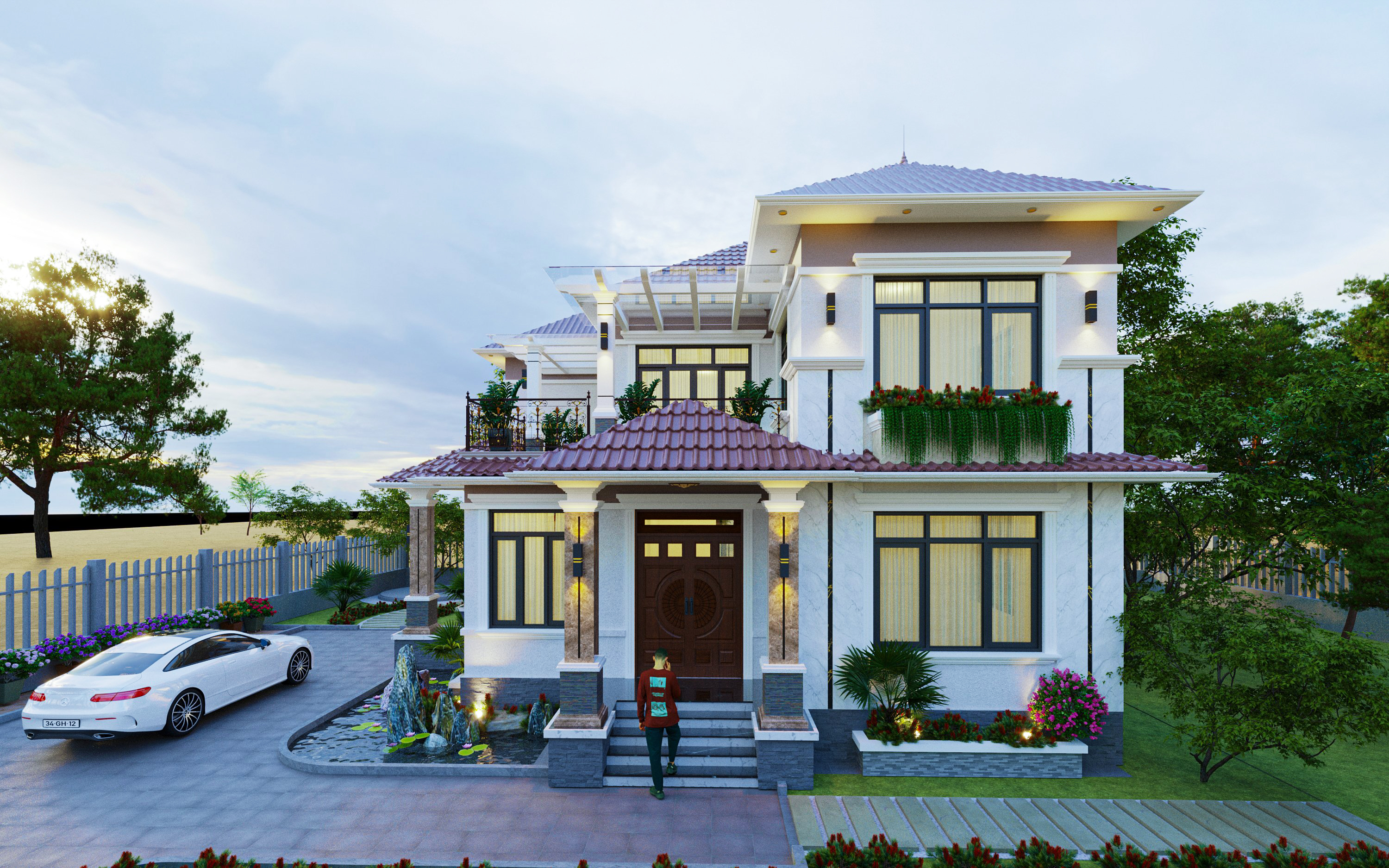 Sự kết hợp hài hòa không chỉ nằm ở khối kiến trúc ngôi nhà, mà đến từ khu vực hàng rào, cánh cổng có sự nhất quán của Hệ cột với đường nét phào chỉ đơn giản.