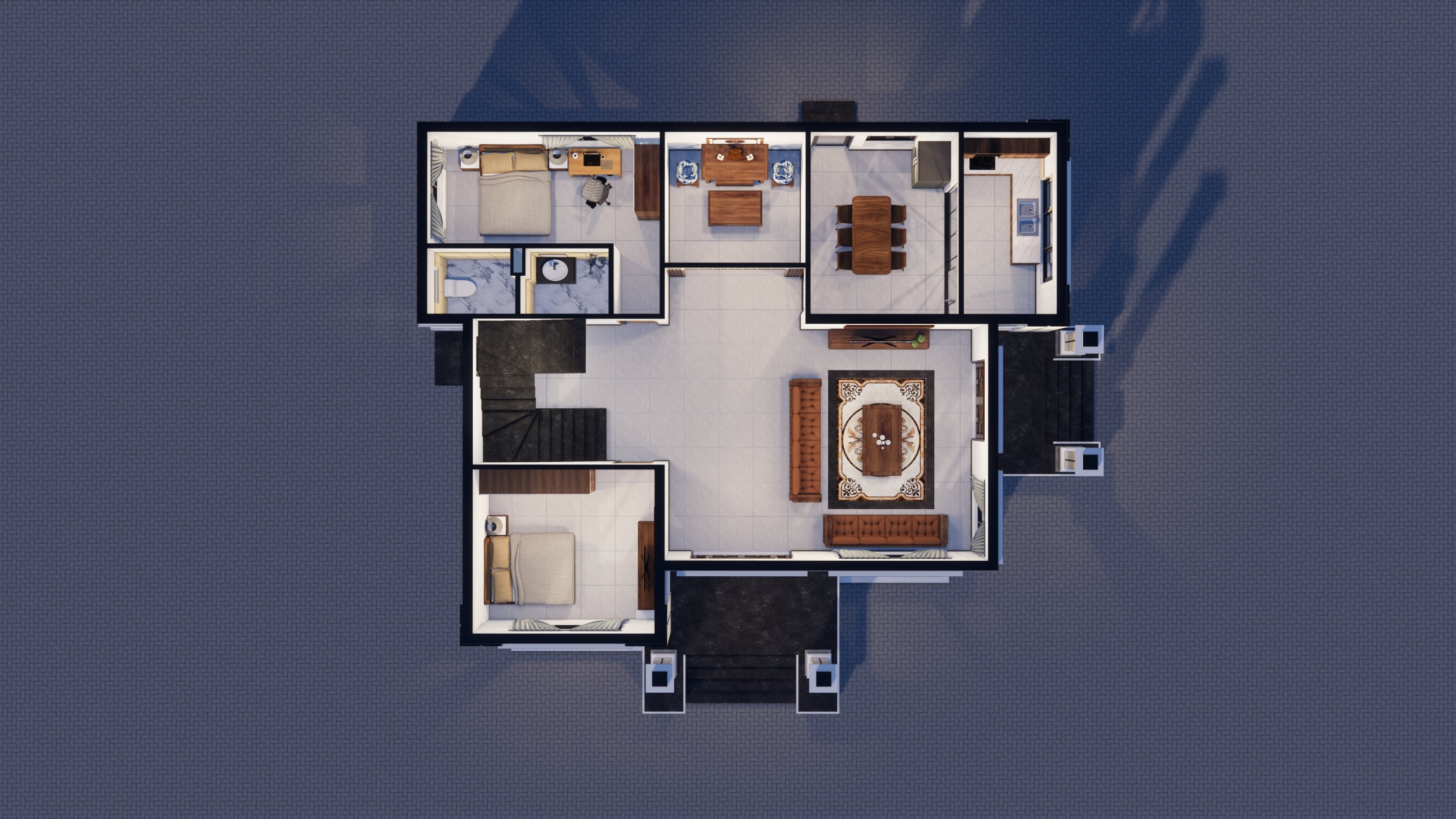 Mặt bằng tầng 2 với khu vực thang, sinh hoạt chung ở chính giữa, và 2 bên là không gian của 3 phòng ngủ. Cùng lối hành lang giao thông thuận tiện.