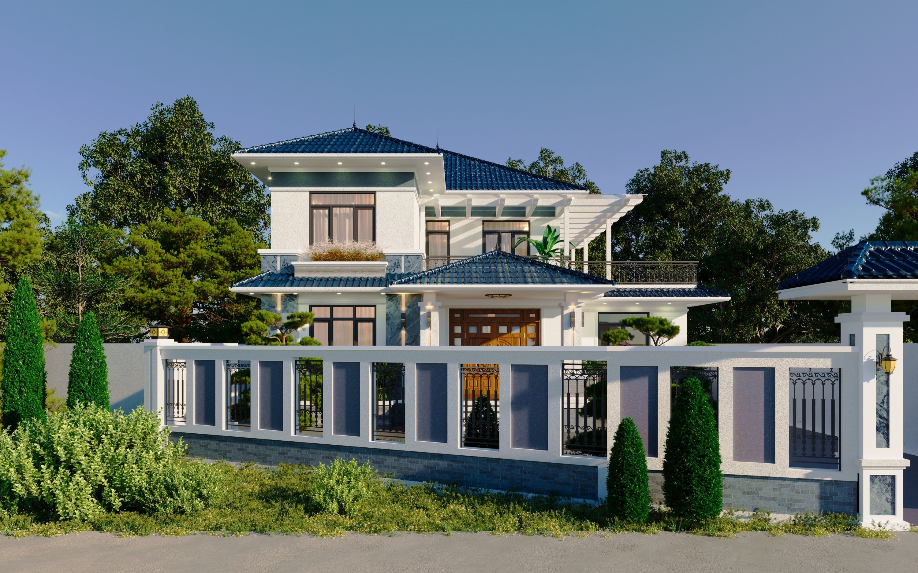 Biệt thự mái Nhật 2 tầng, phối cảnh hiện đại, sang trọng, có sân vườn và cổng rào kiên cố.