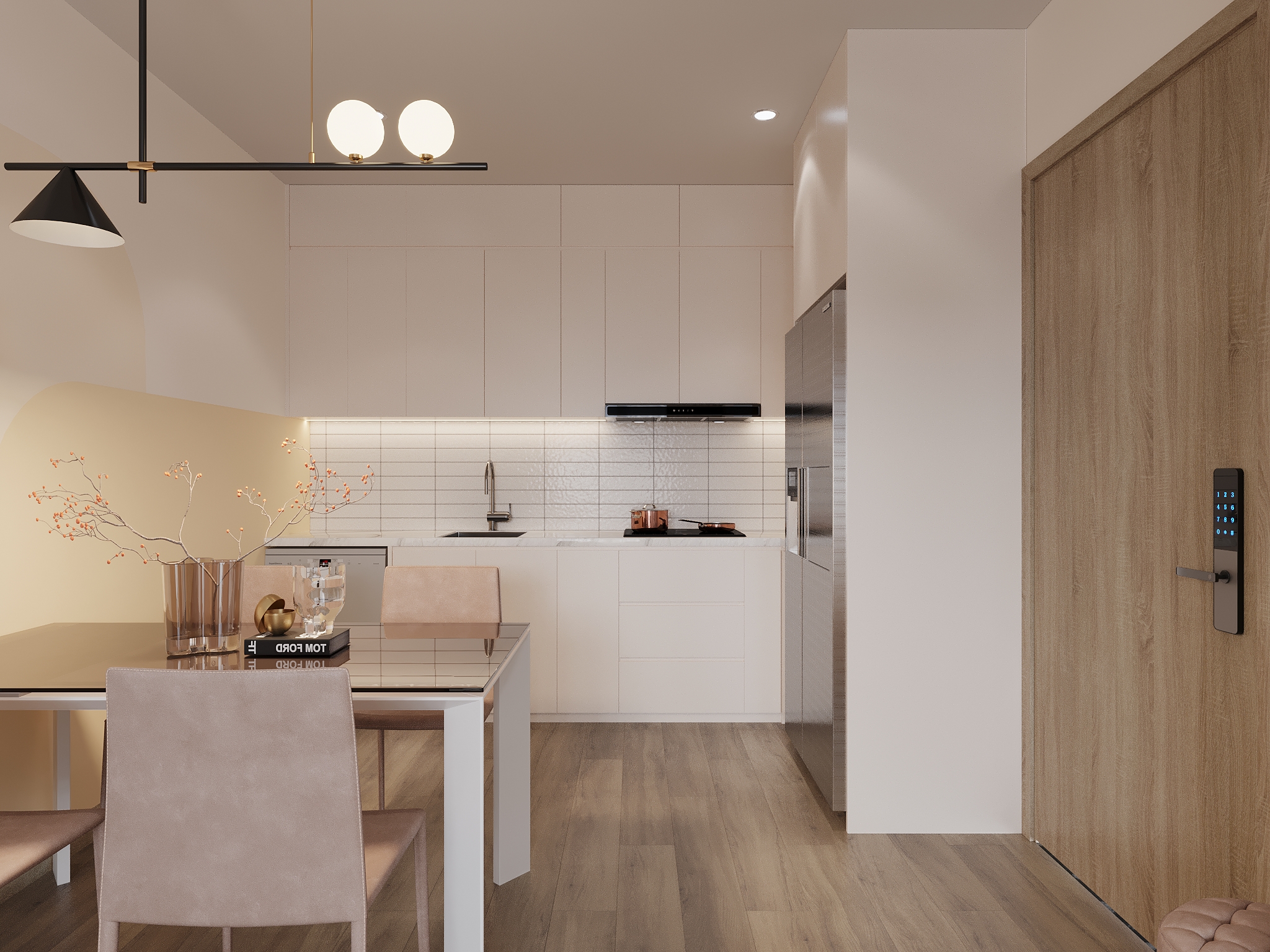 Phòng bếp ăn liền với phòng khách tạo cho gia đình có cảm giác đầm ấm gần gũi với nhau hơn và đặc biệt hợp lí cho gia đình nào có diện tích hẹp mà vẫn có được một không gian đẹp và vẫn rất tiện lợi.