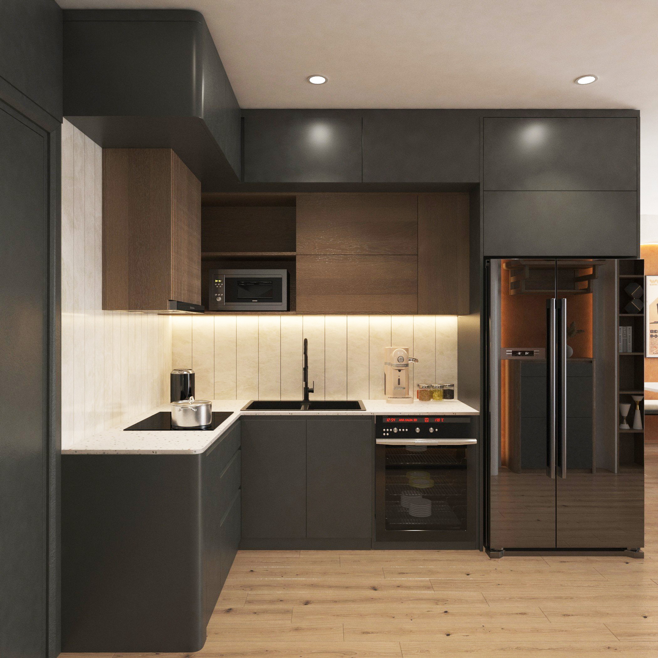 Nếu như không gian bên ngoài được lựa chọn chính là nội thất gỗ , thì phần tủ bếp kiến trúc sư chọn riêng một gam màu và chất liệu khác, hiện đại và trẻ trung hơn. Tủ bếp dưới gam màu đen dễ lau chùi, tủ bếp trên gam màu trắng sẽ giúp không gian có chiều sâu, cao và thoáng đãng hơn rất nhiều