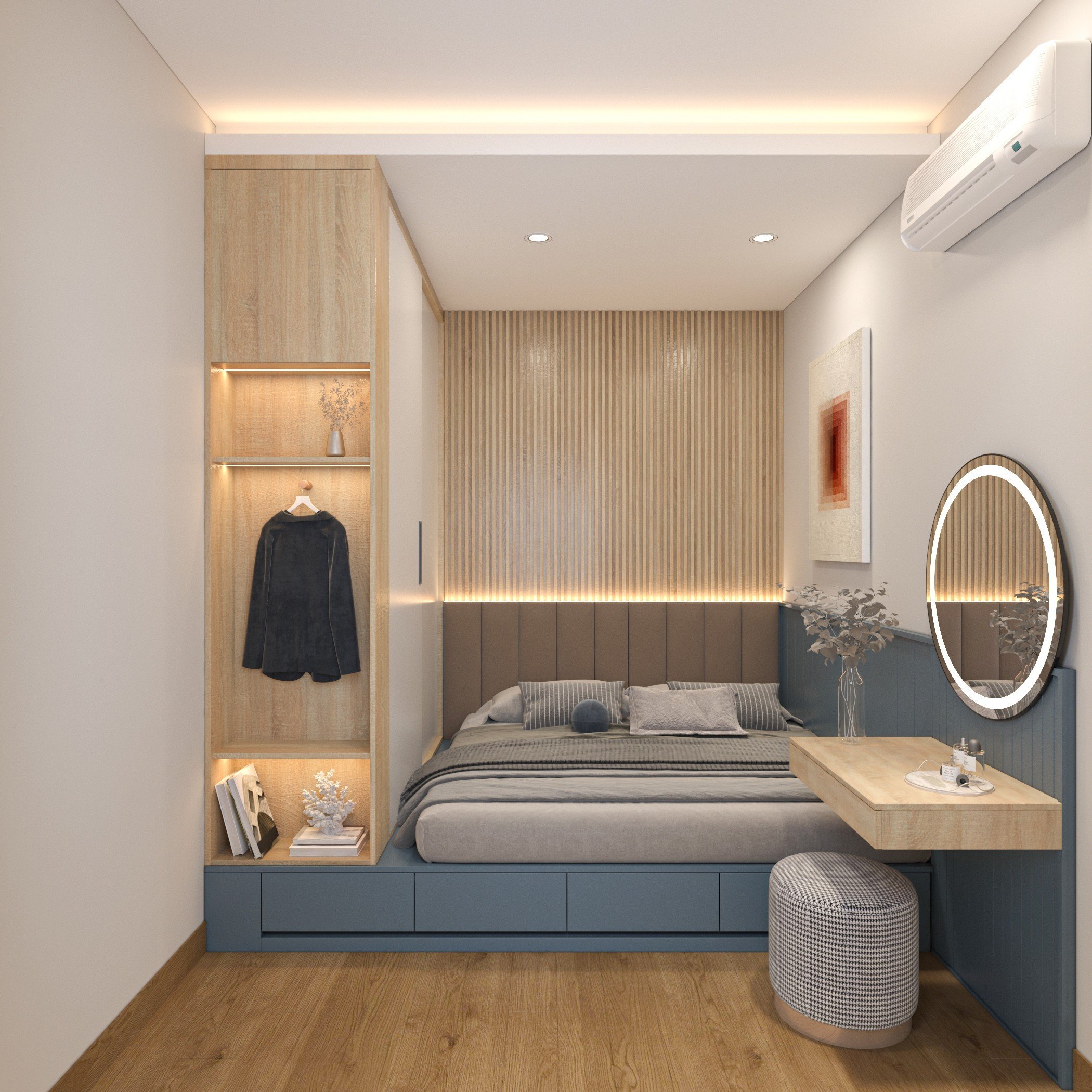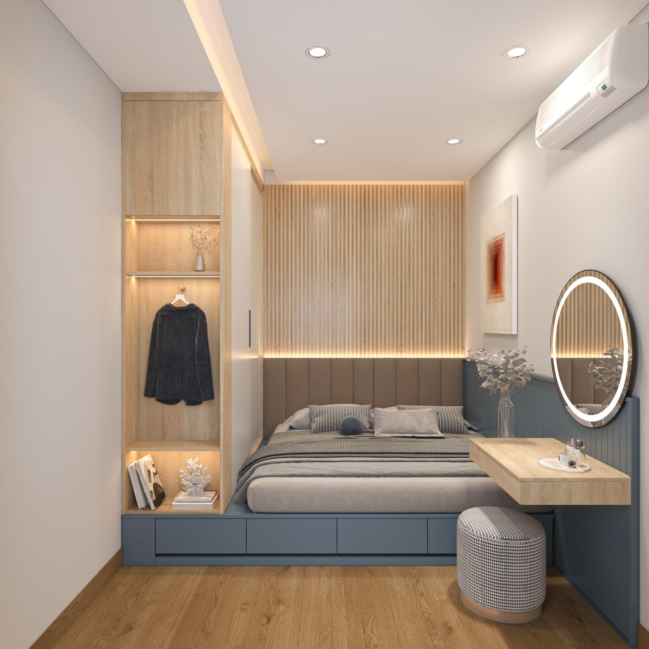Phong cách đơn giản, dịu nhẹ bắt sáng, tủ quần áo giường ngủ được sắp xếp hợp lí khiến cho căn phòng có diện tích trống rộng rãi hơn tủ quần áo được để liền kề với giường ngủ nhưng lại không hề bị vướng víu ngược lại còn rất tiện lấy đồ và giường ngủ cũng được sử dụng loại có ngăn có thể đựng quần áo chưa dùng đến hay là chăn gối chưa dùng, bàn trang điểm cũng được thiết kế một cách tinh tế và hiện đại hơn phần để chân được thoải mái cử động