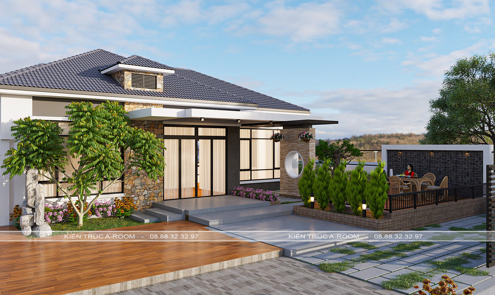 Nhìn vào mặt tiền của mẫu nhà 1 tầng mái nhật này các bạn sẽ thấy được cách thiết kế và bố trí vô cùng khéo léo của kiến trúc sư. Công trình này được thiết kế với 4 phòng ngủ, 1 phòng khách và 1 phòng thờ, khối bếp và gara ô tô được thiết kế tách rời mang đến sự thuận tiện với nếp sống ở vùng ngoại thành Hà Nội và đáp ứng được nhu cầu sinh hoạt của gia chủ.